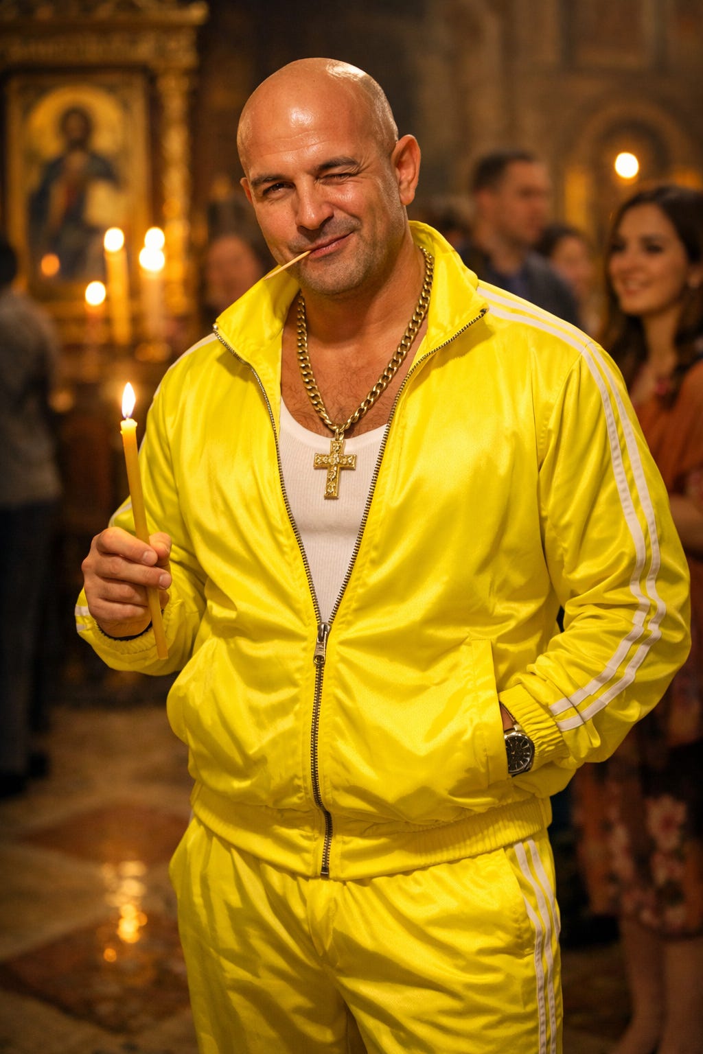 That’s right, because after he lights his candle, if it really, actually, is Pascha Track Suit Guy, what he’s going to do is stick his hands in the pockets of his jacket. Then, while he’s looking around the room and chewing his gum (we have it on good authority that Pascha Track Suit Guy only chews DoubleMint), he will, at some point, take one of his hands out of the pocket and put a toothpick in his mouth.